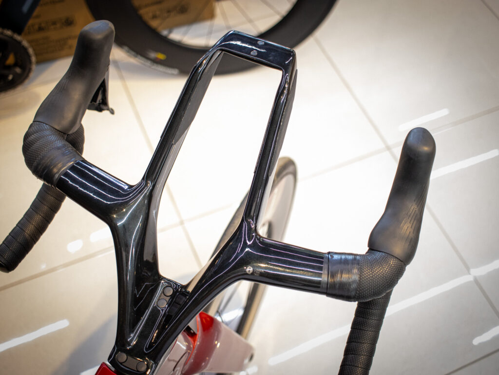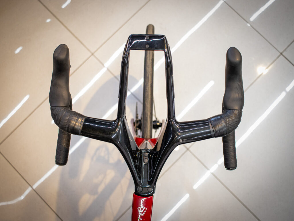 Aquí está uno de los grandes diferenciales de la Java Vittoria. Su manillar híbrido permite adoptar una posición clásica de ruta para subir, frenar y maniobrar con seguridad, pero también ofrece apoyos adicionales para rodar de forma más aerodinámica.