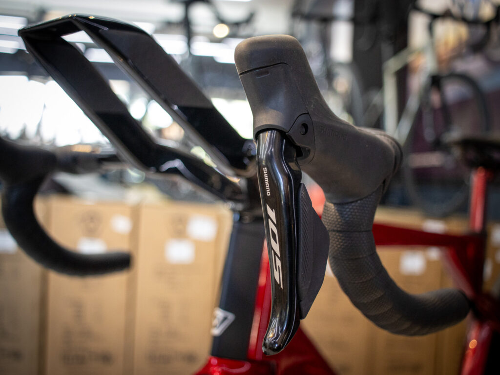 No solo el marco es de carbono: el manillar, la horquilla y la tija del sillín también lo son, lo que refuerza la sensación de bicicleta “full carbono” pensada para competir.