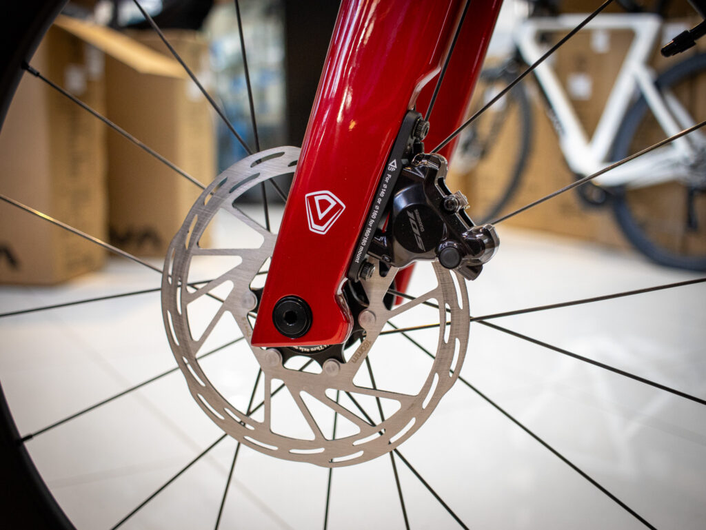 En cuanto al frenado, incorpora frenos hidráulicos Shimano 105, con disco delantero de 160 mm y trasero de 140 mm, asegurando potencia y control incluso a alta velocidad.