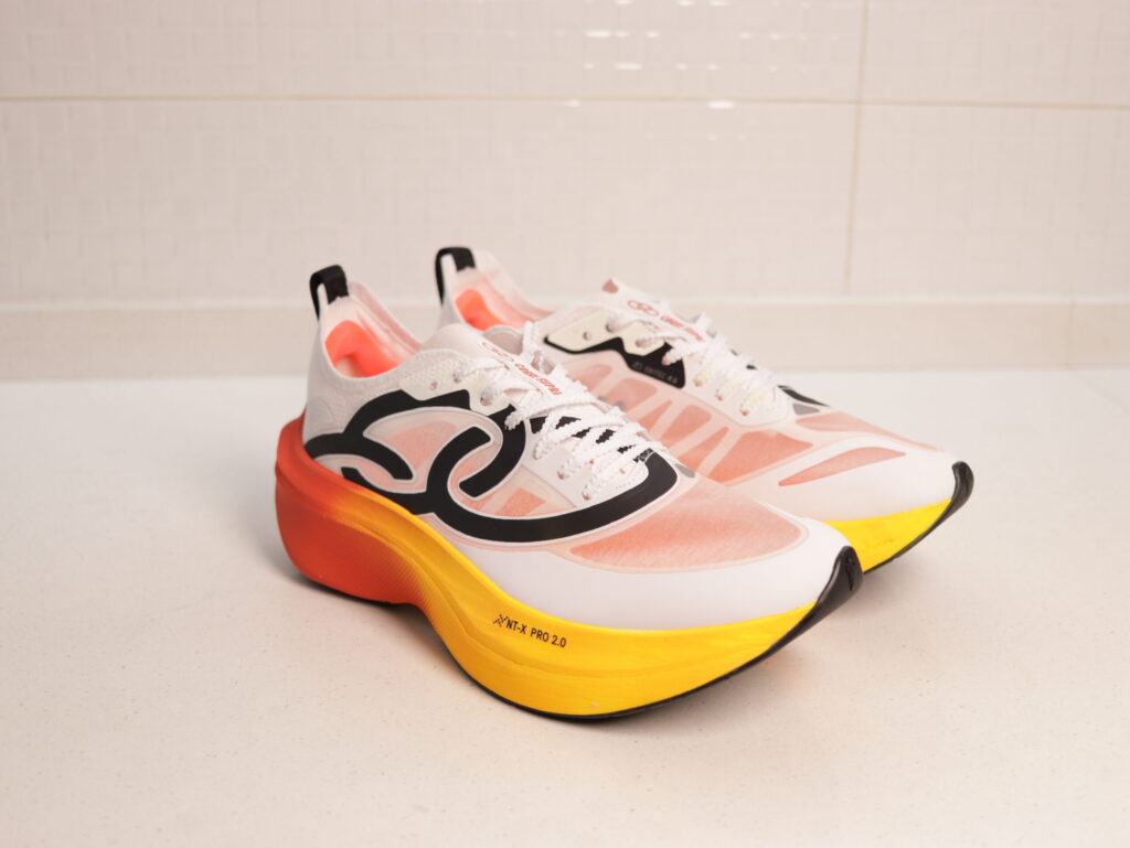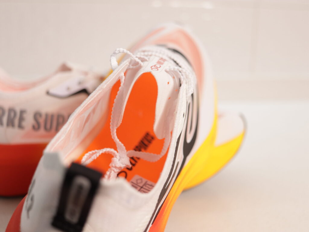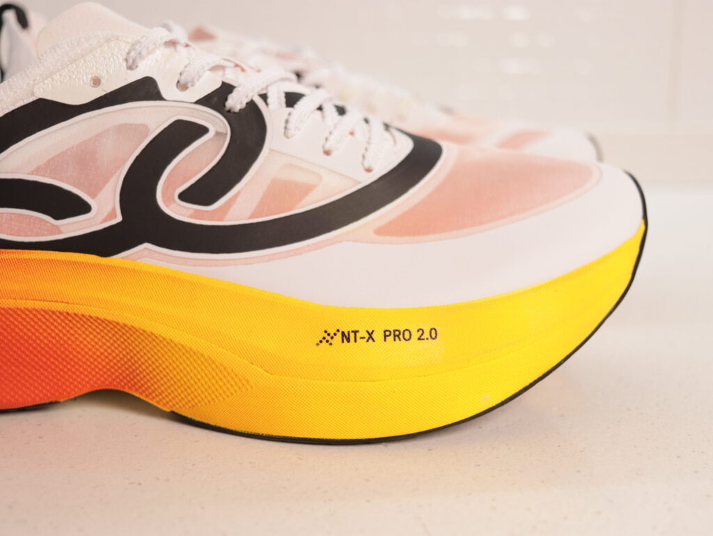 Este material se encuentra entre los más reactivos del mercado y ofrece un tacto blando con buena capacidad de rebote. La zapatilla presenta perfiles de aproximadamente 38 mm en talón y 32 mm en antepié, con un drop de 6 mm, valores cercanos al límite permitido en competición.
