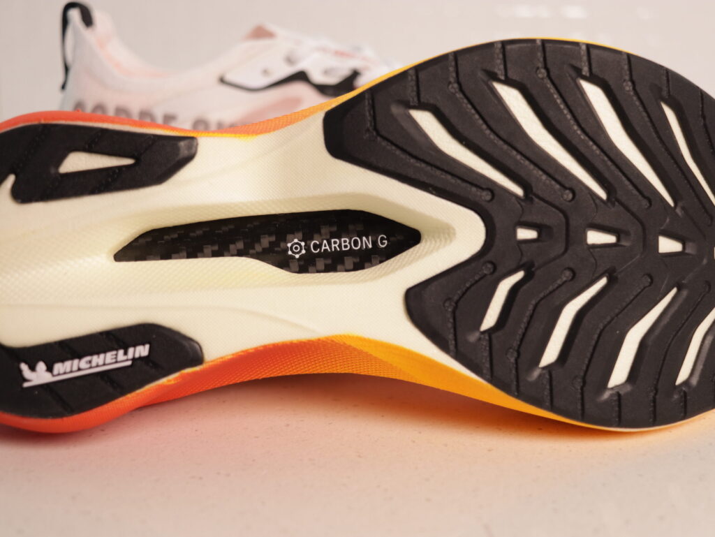 Entre las dos capas de espuma se ubica una placa de carbono denominada Carbon-G, con diseño tipo cuchara. Esta placa incorpora tres capas de fibra de carbono y un recubrimiento de grafeno que busca aumentar su durabilidad y resistencia a la fatiga.