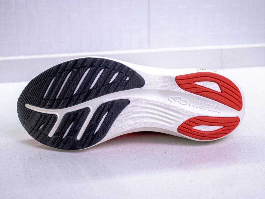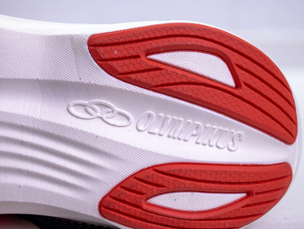 La suela combina goma negra y roja, fabricada con compuesto Griper, desarrollado por Olympikus.