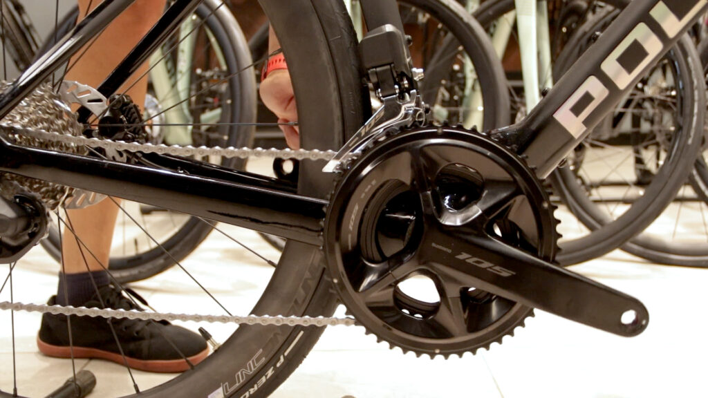 Una bicicleta de alto nivel necesita componentes a la altura. La Polygon HE monta transmisión electrónica Shimano 105 Di2 de 12 velocidades, una configuración que ya se ha ganado un espacio sólido en el ciclismo competitivo.