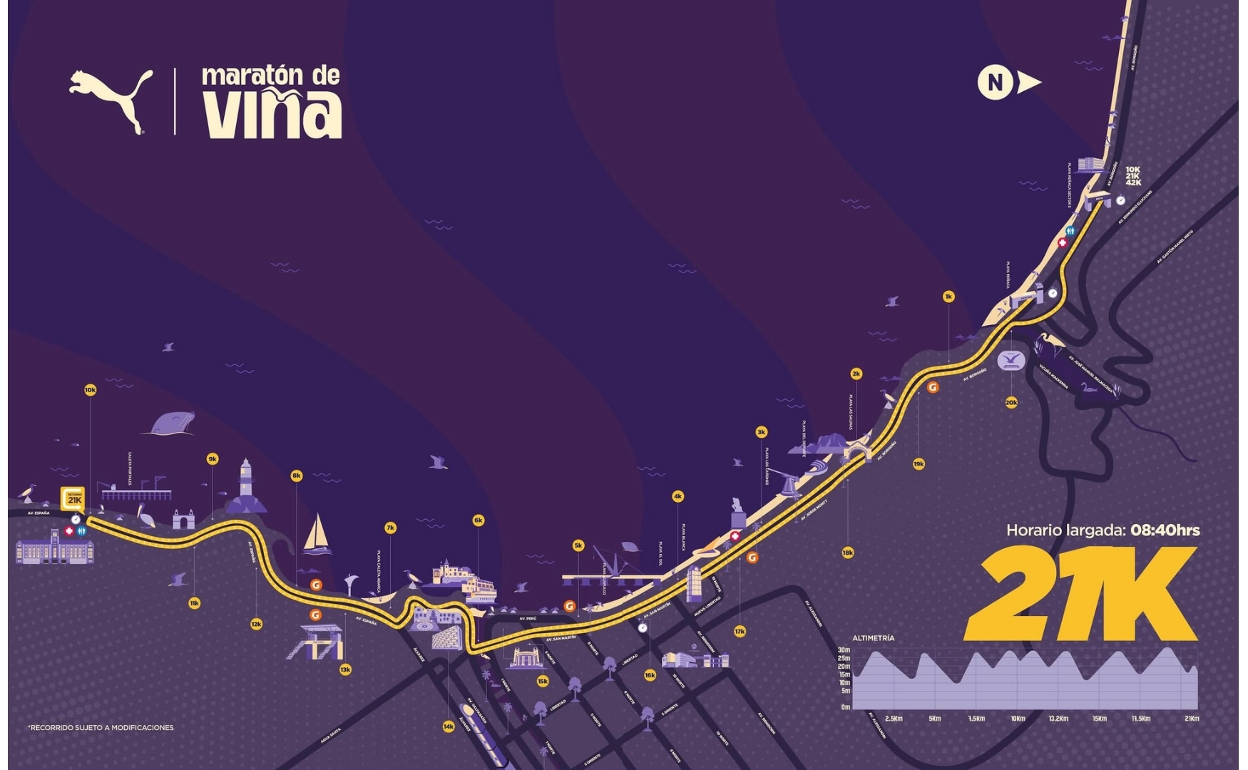 - 21K: ida hasta la Universidad Federico Santa María por Av. España y regreso al punto inicial en Reñaca.